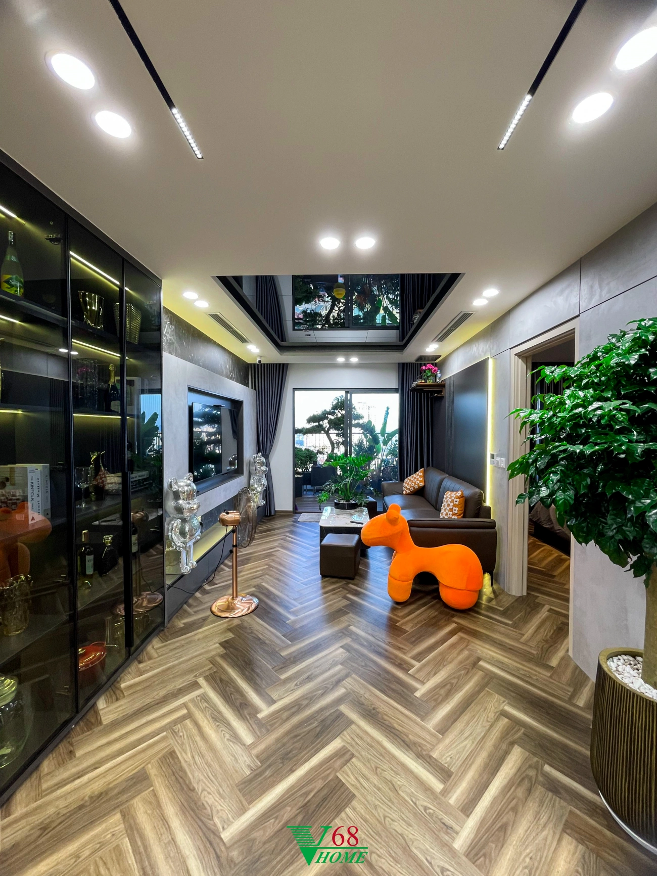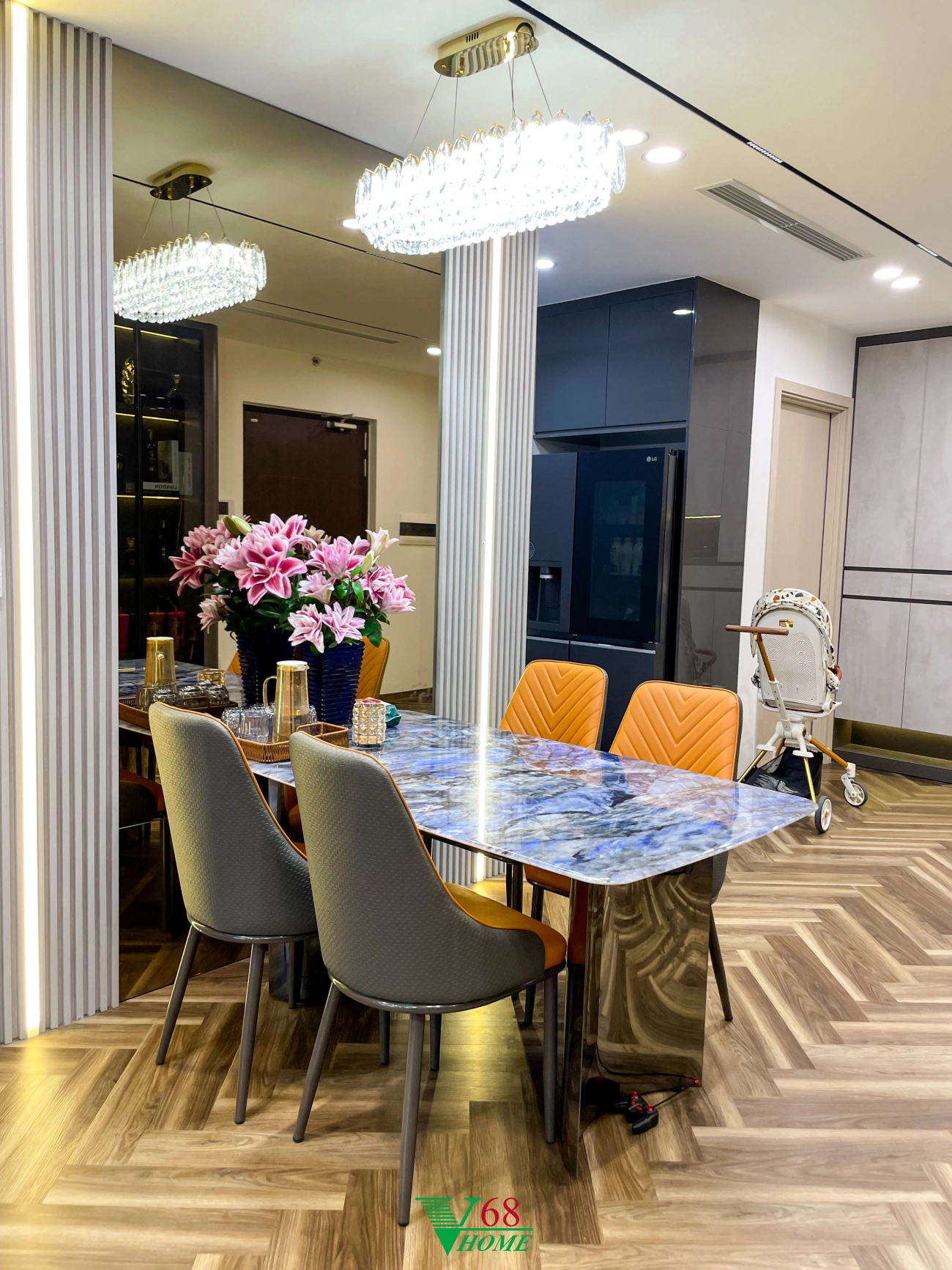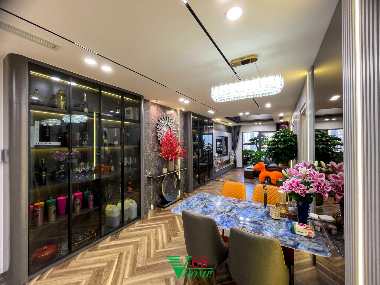 Căn hộ số 10 tại chung cư Feliz Homes, Hoàng Mai, Hà Nội được thiết kế theo phong cách Luxury. Thiết kế sử dụng nhiều loại vật liệu có tính phản chiếu cao như Acrylic, gương, thủy tinh kết hợp với các loại đèn tọa nên một không gian sống sang trọng, đẳng cấp.