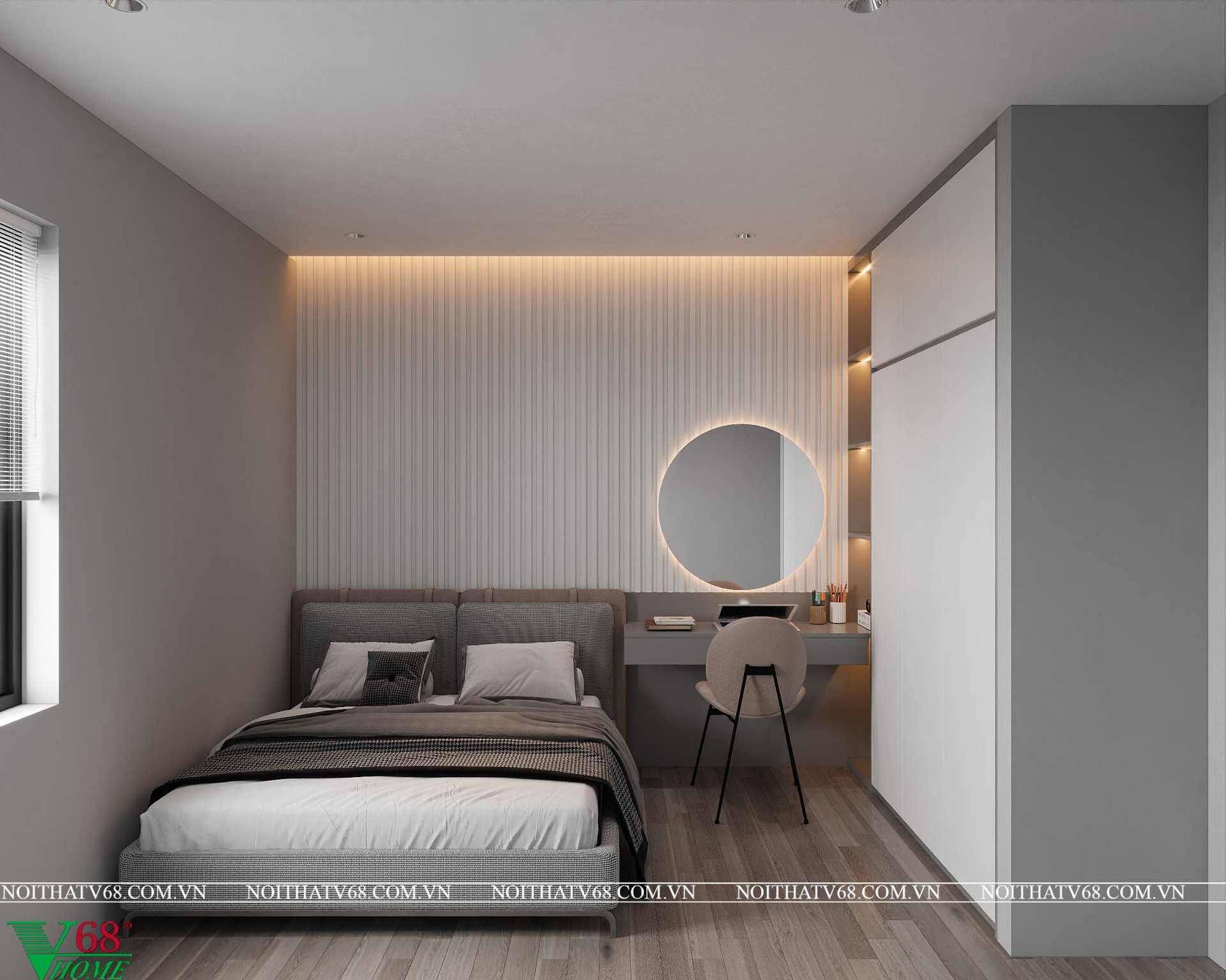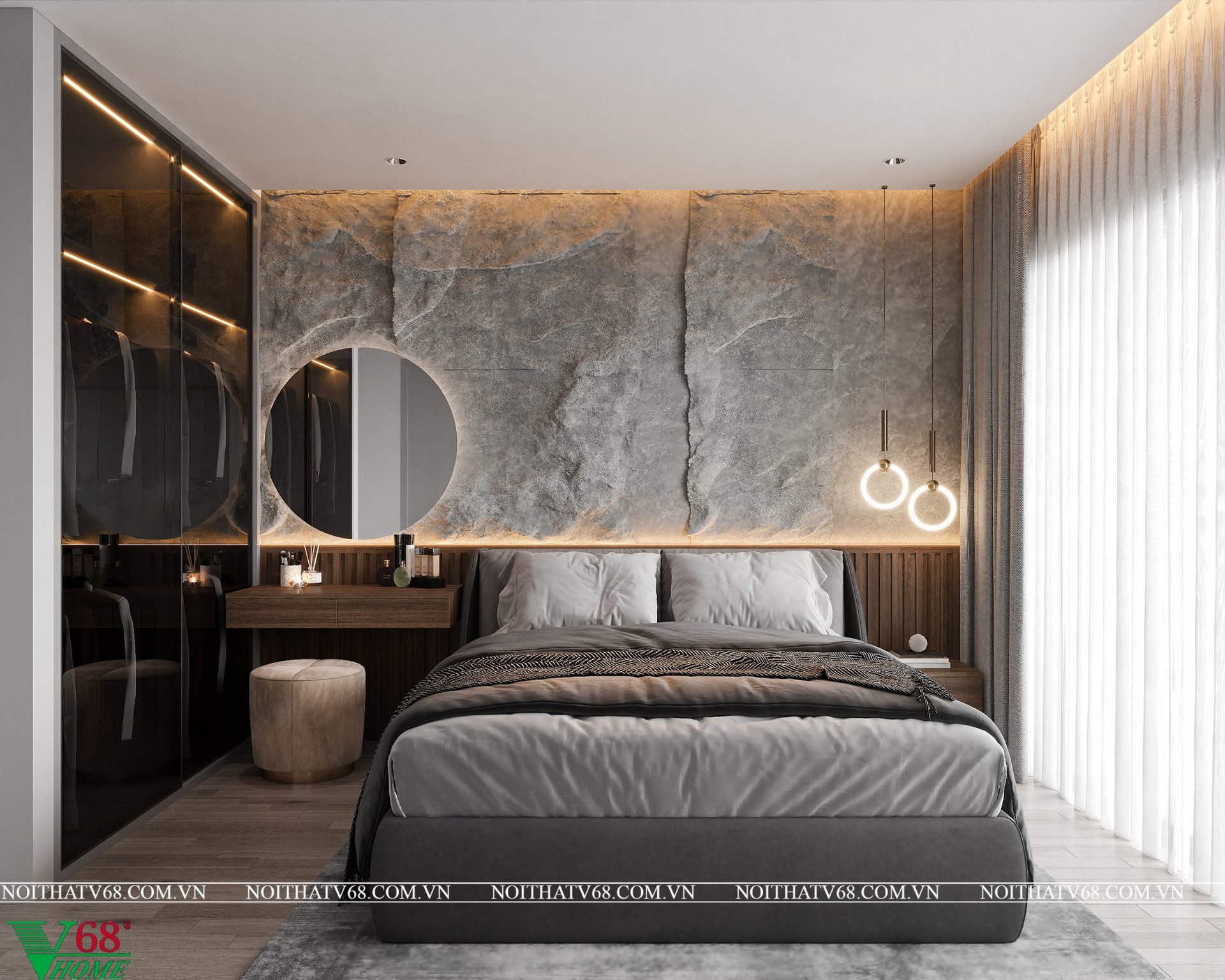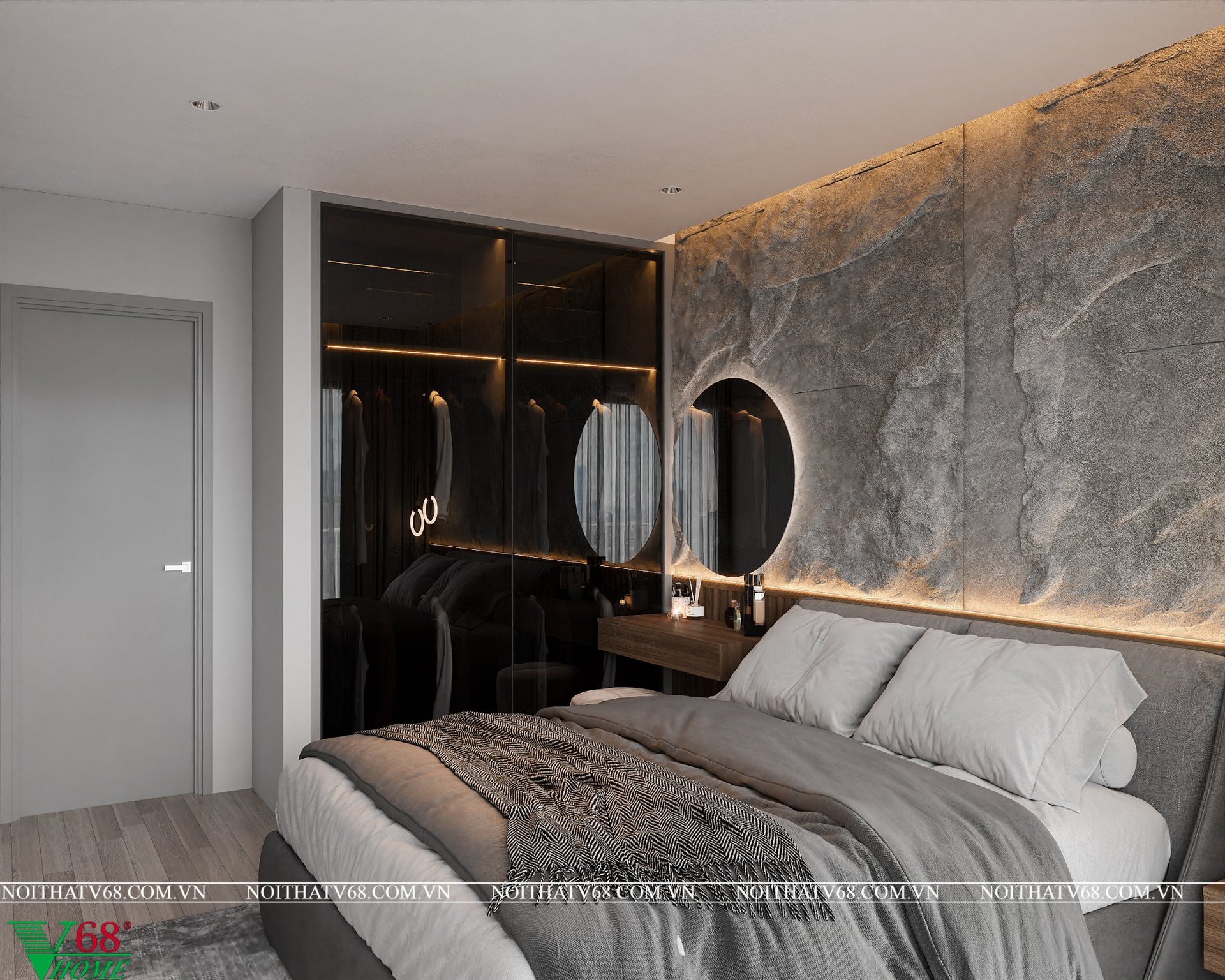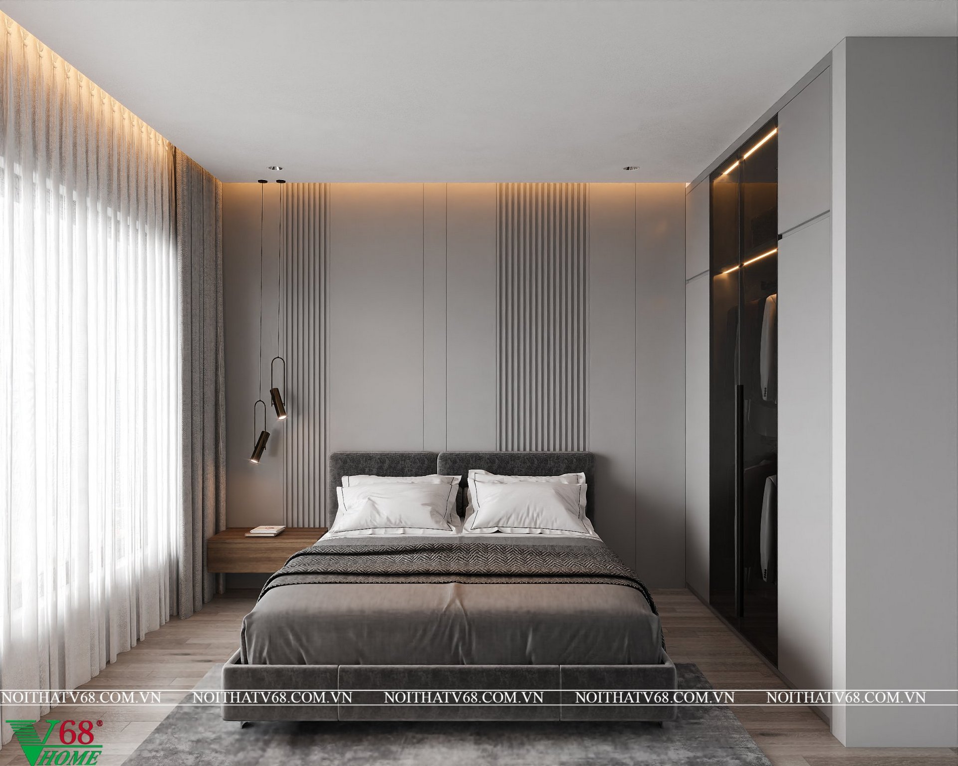Phòng ngủ master được thiết kế với tủ quần áo khung gỗ MDF cốt xanh chống ẩm phủ melamin, cánh tủ bằng nhôm hệ với cánh kính màu xám khói, mang lại vẻ đẹp hiện đại và sang trọng. Đầu giường được ốp bằng giấy dán tường hiệu ứng 3D, tạo điểm nhấn tinh tế cho không gian ngủ.