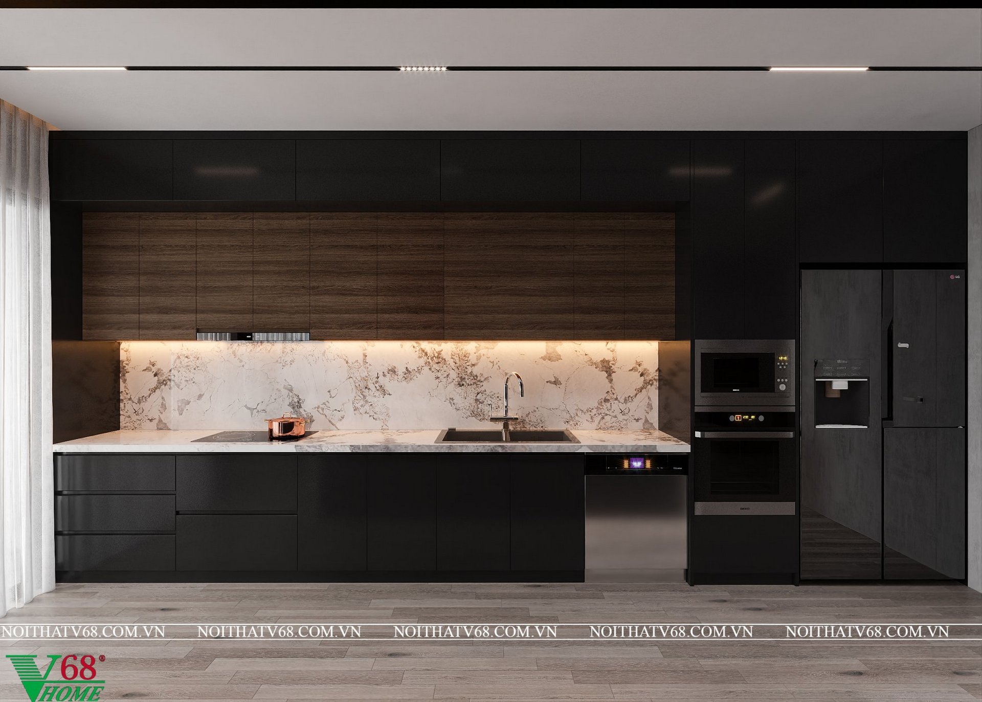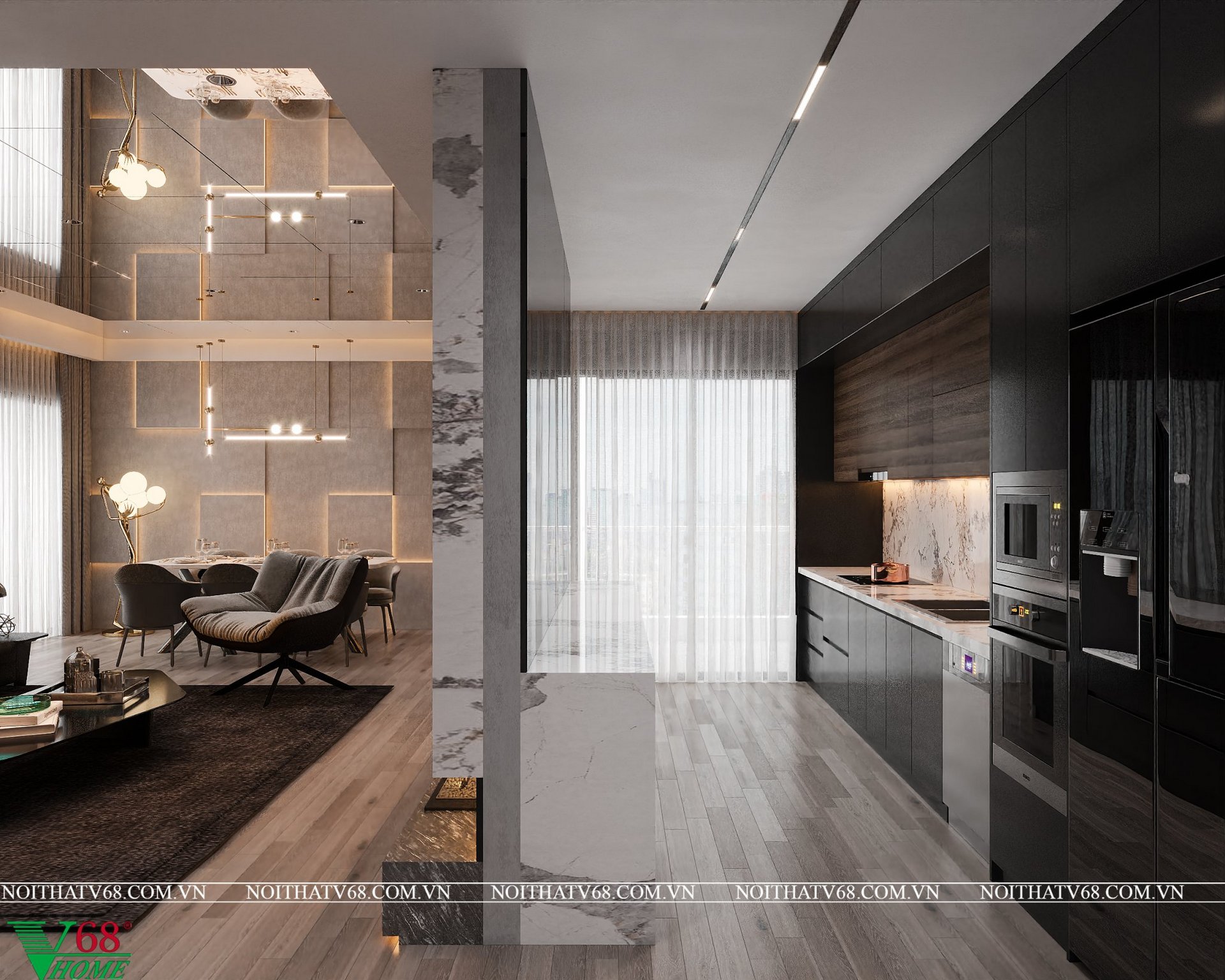 Tổng thể căn hộ được thiết kế theo phong cách hiện đại Luxury với tông màu đen huyền bí kết hợp với các vật liệu có độ phản xạ cao như gương, kính, acrylic tạo nên một không gian nội thất đẹp lung linh.