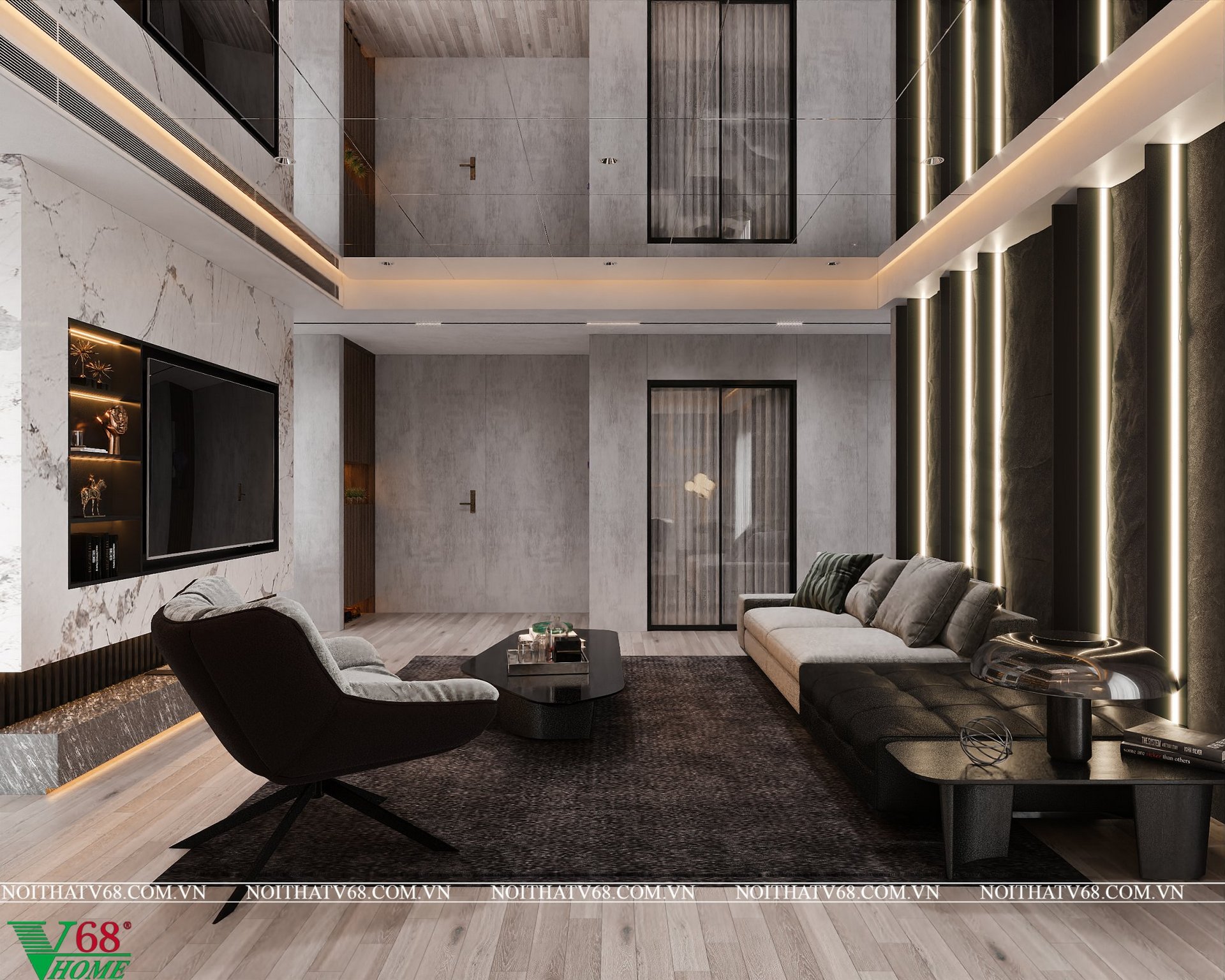 Phòng khách được thiết kế với tông màu trầm, mang lại cảm giác ấm cúng và sang trọng. Tường sau sofa được ốp bằng melamin màu đen, kết hợp với hệ thống đèn LED hiện đại, tạo nên không gian tinh tế và quyến rũ. Kệ tivi được thiết kế kèm tủ trang trí, với tường ốp PVC cao cấp màu vân đá, mang lại sự đẳng cấp và lịch lãm cho không gian.