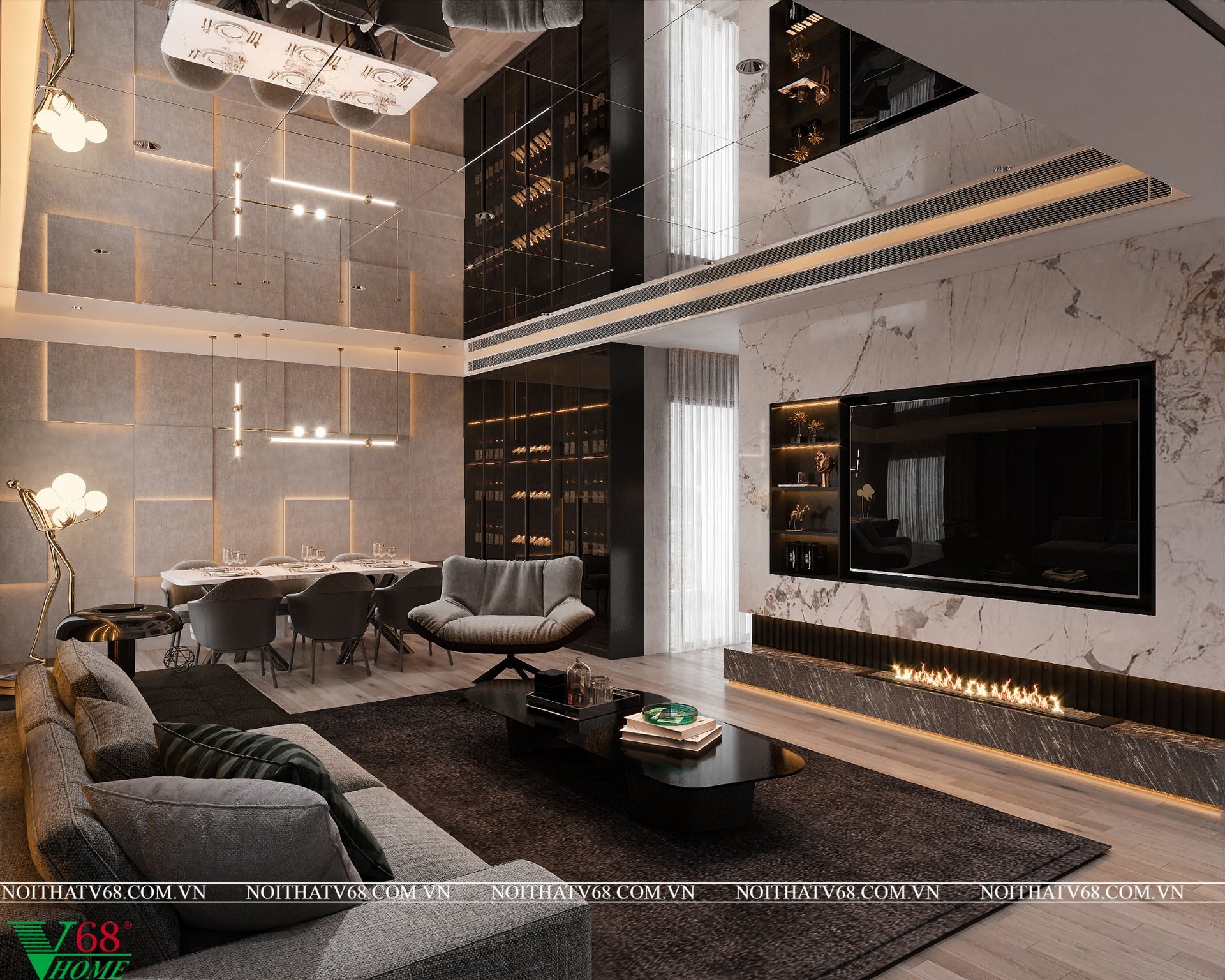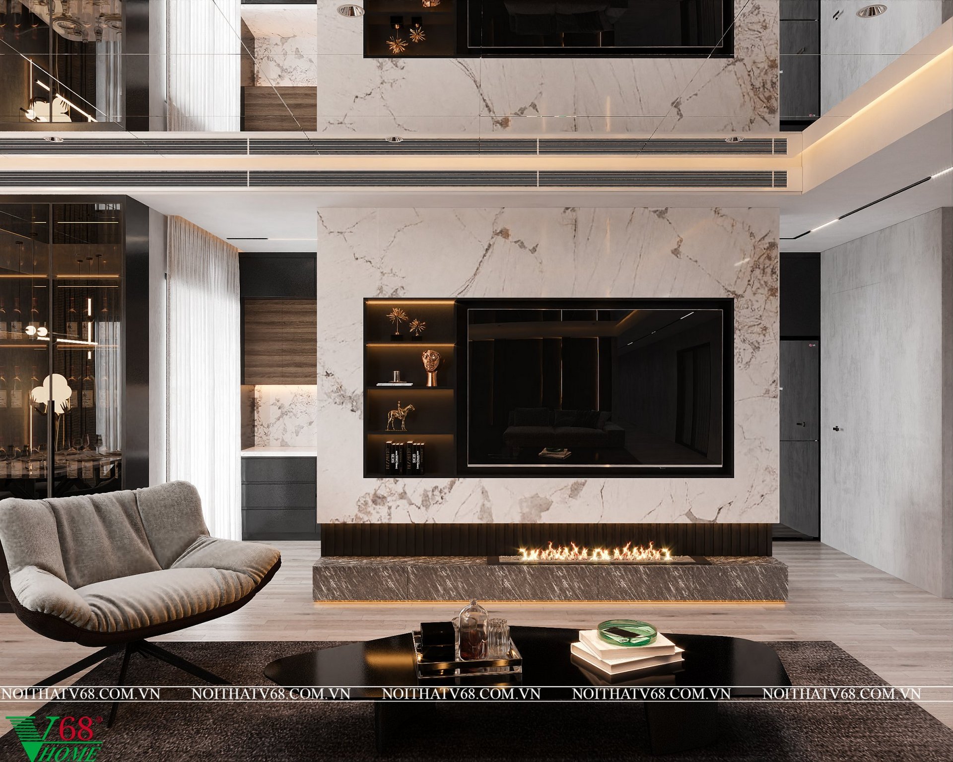 Vách ốp tivi sử dụng đá vân mây kết hợp với lò sưởi điện trang trí, tạo điểm nhấn độc đáo cho phòng khách. Vách ốp tivi này cũng đồng thời đóng vai trò là vách ngăn giữa khu vực bếp và phòng khách, giúp phân chia không gian một cách hợp lý và thẩm mỹ.