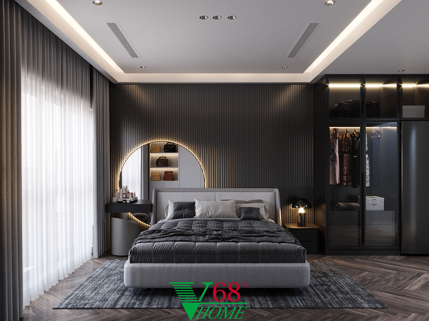 • Giường ngủ: Giường bọc nỉ cao cấp, êm ái, mang lại giấc ngủ ngon cho gia chủ.