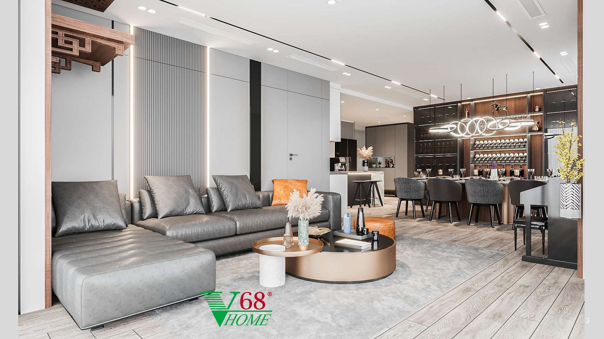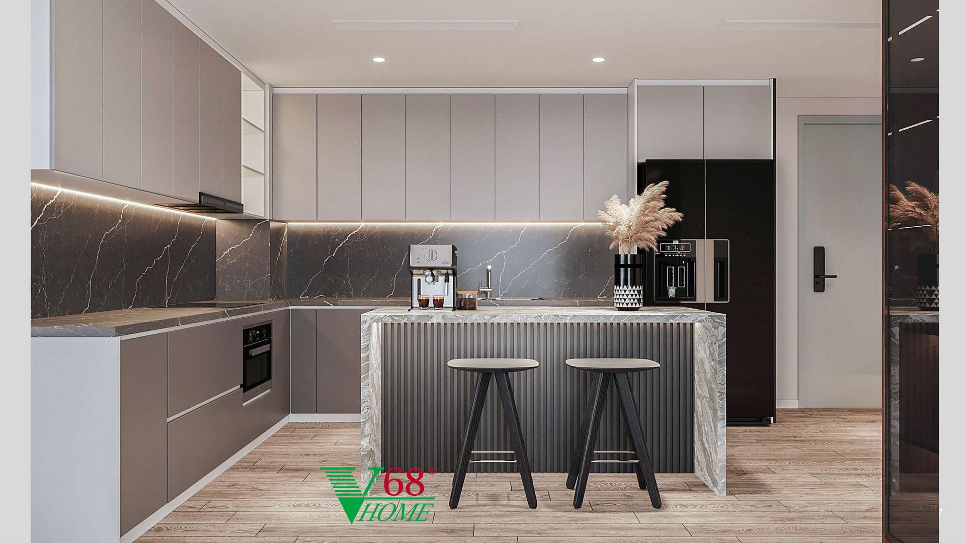 - Khu vực bếp: Nổi bật với quầy bar ốp đá cao cấp, đèn Led và hệ thống ốp vách nan gỗ hiện đại.