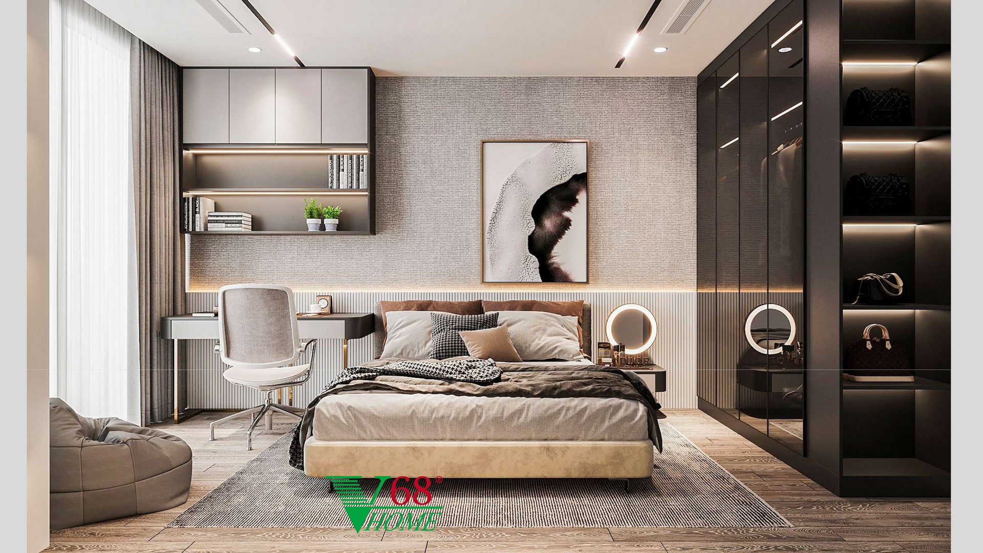 - Phòng ngủ Master: 30m2 rộng rãi, sở hữu hệ thống tủ áo cánh kính sang trọng.